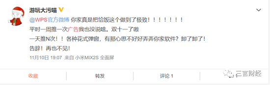 最让人气愤的是双十一期间,WPS被指向用户推送了骚扰广告,用户甚至无法关闭。
