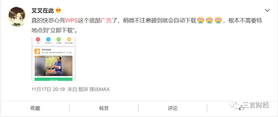 不少网友吐槽,WPS底部广告稍微不注意点击到,就会自动下载第三方软件。
