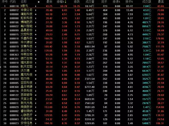 成交额方面,今日合计成交额达61.44亿元,其中,今日登陆的普元信息成交最活跃,成交额达7.04亿元,中微公司成交额为4.53亿元排第二,澜起科技、金山办公、建龙微纳成交额均超3亿元,此外,43只个股成交额不足1亿元。