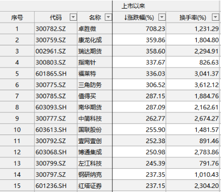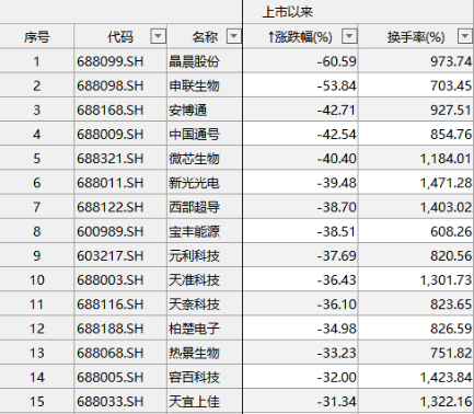 这一现象从新股上市首日涨幅也能看出。由于科创板上市前5个交易日不限涨跌幅,203家新股上市首日涨幅棒前57名被科创板企业包揽。最高的安集科技首日涨幅400.15%,57位的昊海生科首日涨幅46.48%。