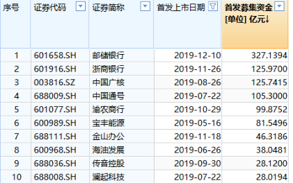 另外,据媒体统计2019年新股募资额是继2011年以后最多的一年。邮储银行、浙商银行、中国广核、中国通号四家超过100亿元的募资,终将记录进2019年的发行历史。为了稳定股价,邮储银行在发行环节引入了“绿鞋”机制。随后京沪高铁这一巨无霸也将发行,值得关注。