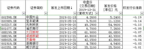 而讨论2019年的新股发行,就不得不提到破发这个关键词。年内共计18家新股出现股票价格一度低于发行价,其中10家属于科创板上市企业。截止2019年12月31日,仍有9家新股收盘价低于首发价格。例如中国外运较首发价跌19%、宝丰能源跌14%、元利科技跌10%、渝农商行跌9%。科创板企业中仅久日新材、卓越新能、杰普特处于破发状态,较年中减少。