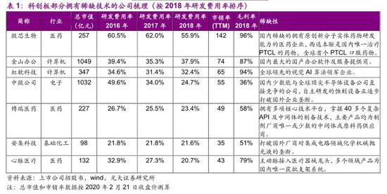 因此,对于主营业务稀缺的公司,即便只是领先其它对手一步,都有望在自身的细分领域构筑深厚的壁垒,我们认为可以更关注科创成色较深且稀缺性强的公司。首先可以按研发支出/营业收入 3 年平均超过 20%,并结合公司主营业务在国内的稀缺性,以及在所处赛道的地位进行筛选,表 1 是我们认为在科技创新方面较为稀缺的公司。
