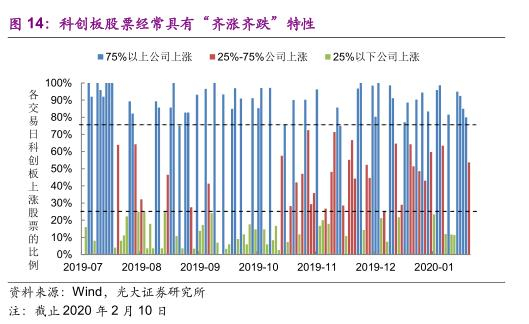 从科创板开通 以来,可发现科创板股票的第二大特点是具有齐涨齐跌的特征。统计显示,截止 2020 年 2 月 10 日的 131 个交易日中,科创板出现75%以上的股票同时上涨的交易日有53天,75%以上股票同时下跌有46天;进一步统计,90%以上股票同时上涨或下跌的交易日有 52 天。相比于 A 股市场在 2019 年下半年以来呈现的行业轮动行情而言,科创板板块内部股票走势呈现明显的系统性。