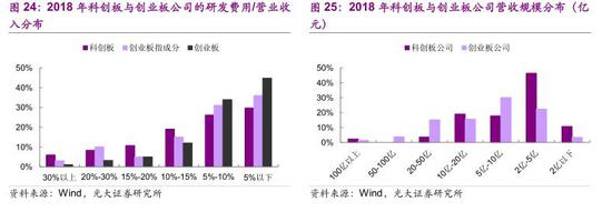 从规模看,科创板公司整体规模较小,共 57%的公司营收规模低于 5 亿元,创业板营收规模小于 5 亿元的公司仅占 25%整体;创业板营收规模大于20 亿元的公司占比 21%,而科创板仅有 6%的公司大于 20 亿元。