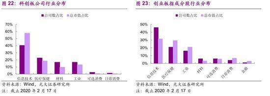 科创板公司定位是拥有关键核心技术,科技创新能力突出的较强成长性的企业,同时在上市行业推荐指引上,也重点规划了方向(1)属于新一代信息技术、高端装备、新材料、新能源、节能环保和生物医药等高新技术产业;(2)互联网、大数据、云计算、人工智能和制造业深度融合的科技创新企业。从已上市的科创板公司看,科创板约 40%的公司来自信息技术行业,23%来自医疗保健行业,17%的材料行业公司也多为新材料领域。该行业构成情况与当前的创业板指成分股相近,消费、金融和传统工业占比较低。