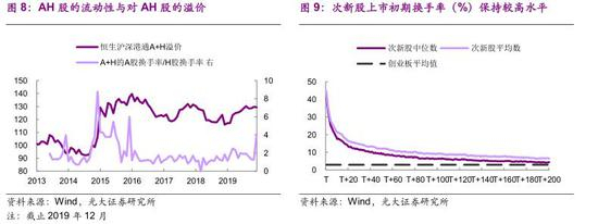 另一方面,新股的这种估值溢价我们认为也可以从流动性的角度进行解释。以我们熟知的 A+H 股为例,由于 A 股流动性长期好于港股,因此即便每一股股票反映的内在价值相同,但 A 股相对于港股公司在多数时间是处于溢价的状态,新三板公司的估值低同样与市场极低的流动性有关。 因此可以认为相同资质的资产,流动性高的资产往往能够获得更高的溢价。
