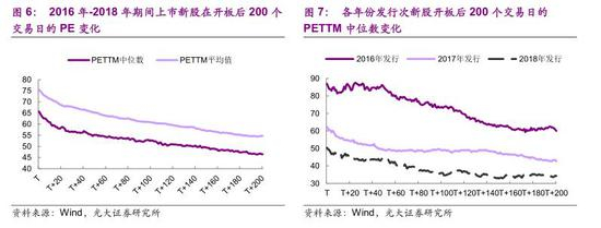 从科创板的上述两个特征, 可以总结出 科创板 新上市的公司 可能 在较长时间内 保持看起来估值偏贵的状态,这种状态由次新股无减持压力 、高流动性 、潜在的高增长预期和适度加杠杆空间 决定。随着解禁期的临近,活跃度下降,再加上市场信息逐渐充分以后,科创板公司的表现可能会出现分化,回归由基本面驱动。 这样意味着对于其中优质的公司,上市初期可能是难以按极为便宜的 价格去买进 (图 16 、图 17 ) , 而是需要从成长的角度, 对偏高估值水平给予一定的容忍度 ,进行耐心持有