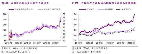 科创板的这种市场情绪波动带来的难得买点,与其特有的次新属性分不开,创业板第二大成分股迈瑞医疗同样出现过类似状况。迈瑞医疗于 2018年 10 月 16 日上市,并在 10 月 18 日上证综指跌破 2500 点时开板,市场情绪极为低迷,当日收盘对应的 PETTM 为 38 倍,对应 2018 年业绩的 PE 仅24 倍,作为优秀的国产医疗器械龙头,当时估值水平低于行业平均水平。此后股价同样出现快速修复,从开板至 2020 年 2 月股价上涨超过 2 倍,远远跑赢创业板指和医药指数。