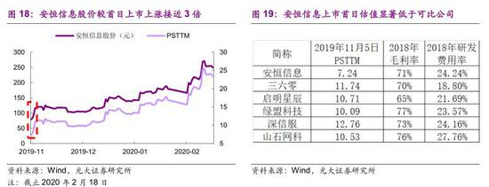 以安恒信息为例,公司上市首日(2019 年 11 月 5 日)收盘价 79.06 元,对于轻资产的成长期软件公司,我们采用 PS 指标刻画估值 3 ,安恒信息对应的 PSTTM 为 7.24 倍,若以最低价则对应 PSTTM 不足 7 倍,远低于行业平均水平。但是从反映技术壁垒的毛利率和研发投入水平等指标看,公司并未显著低于其它可比公司,而且公司在云安全、态势感知等信息安全领域技术实力雄厚,究其原因还是在于科创板市场情绪所致。当时科创板正处于持续下跌阶段,上市首日收益率被不断压缩,昊海生科等部分公司在上市数日内出现破发现象,因此导致部分优质公司受情绪扰动出现极端的低价。随后 10个交易日,安恒信息快速进行估值修复,PSTTM 水平约修复至 12 倍,股价涨幅超过 60%,进入 2020 年,安恒信息的 PSTTM 逐渐突破 15 倍。