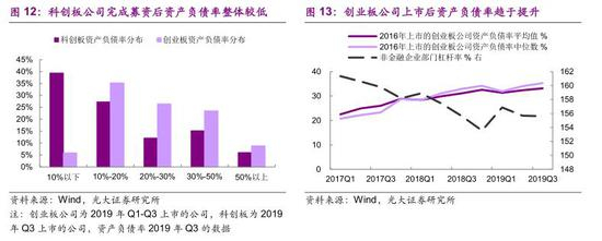 以 2019 年 Q3 上市的 34 家科创板公司,在完成募资之后,资产负债率总体处于较低的水平,接近 40%的公司资产负债率低于 10%,79%的公司资产负债率低于 30%,而同为 2019 年上市的创业板公司,募资完成后的资产负债率明显更高。而且上市后,企业融资渠道更加丰富,财务杠杆往往会趋于提升,我们选择在中国去杠杆周期之前的 2016 年上市的创业板公司,观察到这一部分公司在上市三年后的资产负债率逐年提升,与非金融企业杠杆率下降的趋势相背离。