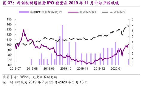 综上所述, 科创板在 2019 年 年 12 月以来突出的表现,是在科技创新周期上行趋势进一步确认,“非典型滞胀”压力缓解 后 的政策取向趋于宽松,以及科创板 IPO 注册 进度。 趋于常态化等多方面条件共同驱动的。 对于后期的科创板,我们认为在科技创新周期 仍然向上 ,疫情 拐点到来之前政策仍将保持宽松的条件下,科创板有望与创业板一致保持良好趋势,相对于创业板大概率仍将保持一定的估值溢价 。后期需要 关注 科创板 IPO 注册工作的恢复情况对板块公司“稀缺性”的影响。