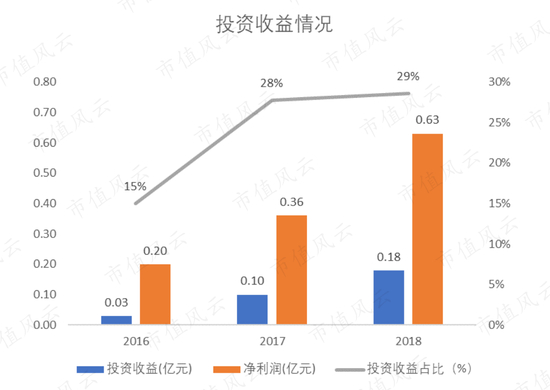 2016年慧辰资讯的投资收益只有300万,2018年就暴增至1800万。投资收益占净利润的比例也从2016年的15%增长到2018年的将近三分之一。