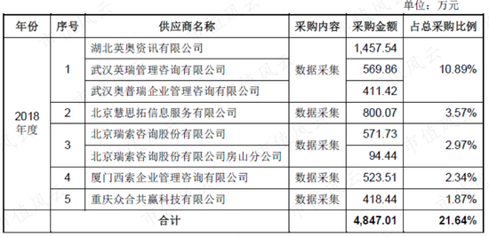 慧辰资讯除了采购数据,还对外采购一些软硬件设备。2018年,与前五大供应商发生的交易均是数据采购。