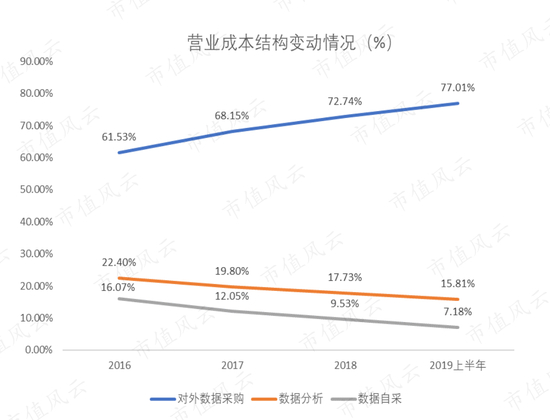 2016-2019年上半年,对外采购数据的支出占营业成本的比例从62%增加至77%。