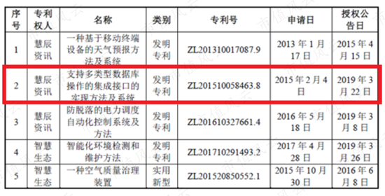 风云君细细地看,这5项专利中,貌似只有第二项专利和慧辰资讯的主营业务相关,其他的专利都是有关“天气预报”、“环境检测”、“空气治理装置”之类的。