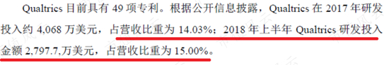 2018 年上半年Qualtrics 的研发投入高达2798万美元,占营收的比重接近15%。