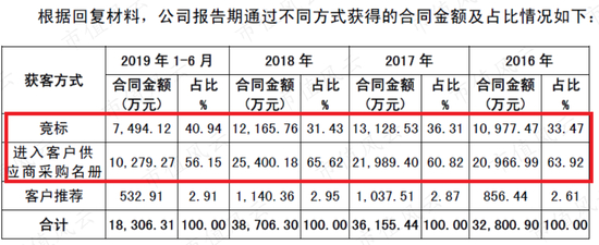 根据慧辰资讯的回复材料,2019年上半年,公司90%以上的合同金额来自竞标和进入客户供应商名单。