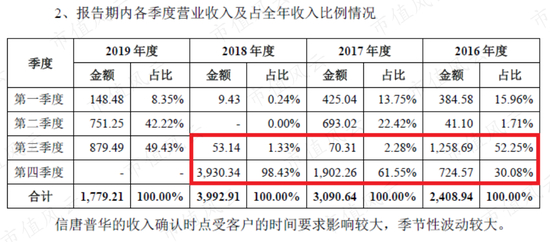 2019年上半年,信唐普华的净利润只有162万,和2018年全年相比明显是很低的,这主要是由于信唐普华的收入存在明显的季节性波动。