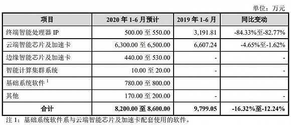 机构的谨慎源于公司的业绩。2020年上半年,寒武纪预计实现营收为8200万元至8600万元,同比下滑16.32%到12.24%,预计亏损为2.1亿元到2.3亿元。