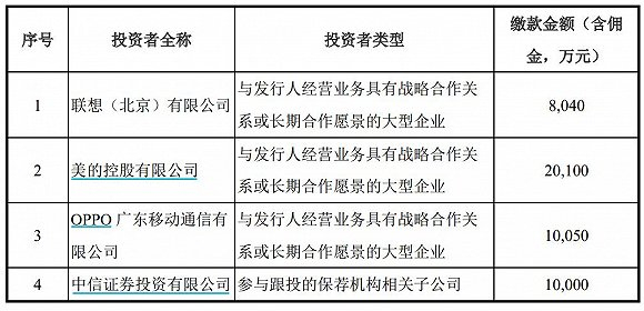 在4家战略投资者中,除保荐券商中信证券外,联想(北京)有限公司(下称联想)、美的控股有限公司(下称美的)、OPPO广东移动通信有限公司(下称OPPO)分别认缴8040万元、20100万元和10050万元。