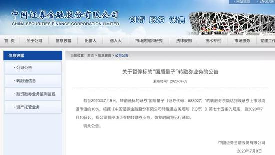 但在7月9日晚间,国盾量子的软融券业务遭暂停。中国证券金融股份有限公司公告称,截至2020年7月9日,转融通标的证券“国盾量子”的转融券余额达到该证券上市可流通市值的10%。根据相关规定,自2020年7月10日起,证金公司暂停该证券的转融券业务,恢复时间将另行通知。