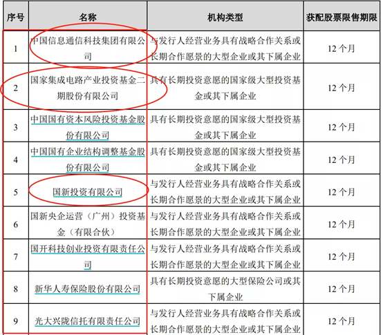 29 名战略投资者参与了配售,国家大基金二期和新加坡政府投资公司认购在30亿元以上,分别为35.18亿元、33.17亿元。中国信息通信科技集团有限公司、国新投资有限公司、中国国有企业结构调整基金股份有限公司、青岛聚源芯星股权投资合伙企业、中国保险投资基金均认购10亿元以上。