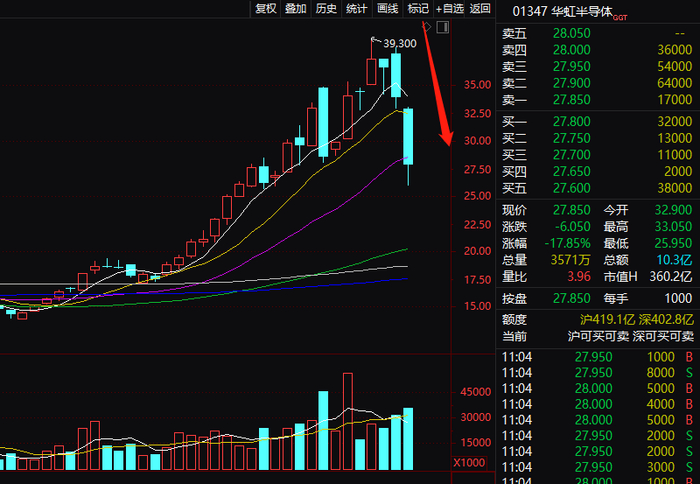 华虹半导体盘中昨日暴跌之后,今日盘中一度跌逾20%。