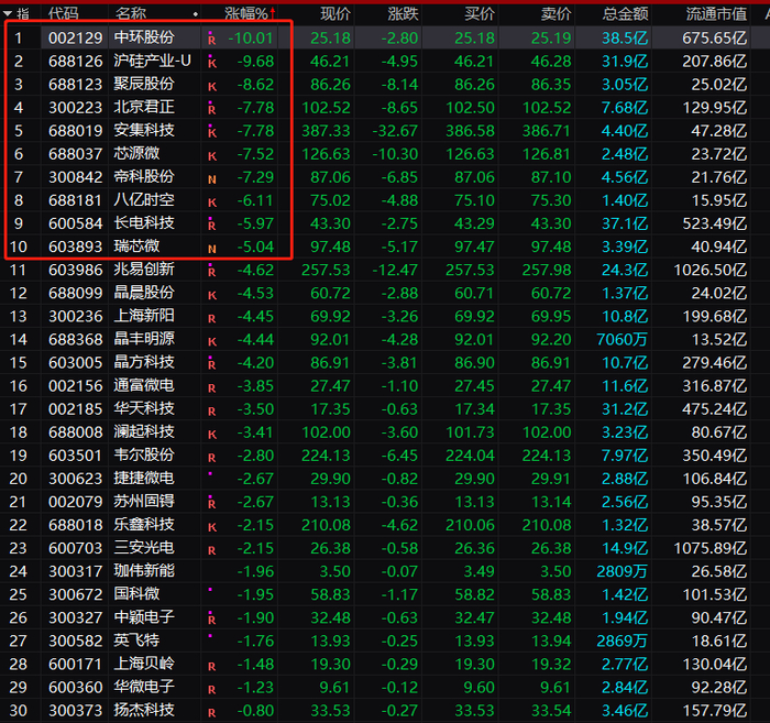 今日相关半导体概念股大幅下跌。A股中环股份跌停,沪硅产业昨日高位跳水跌19.94%后,今日上午再度跌10%;聚辰股份、北京君正、安集科技等也纷纷大跌。