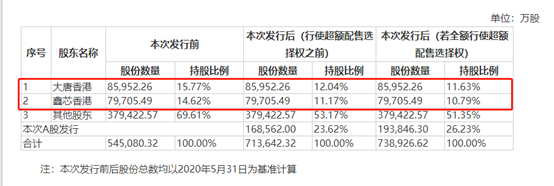 本次发行前,大唐香港和鑫芯香港是中芯国际的前两大股东,持股占比分别为15.77%和14.62%。大唐香港由中国信息通信科技集团间接全资控股,鑫芯香港为国家集成电路产业投资基金间接全资控股。