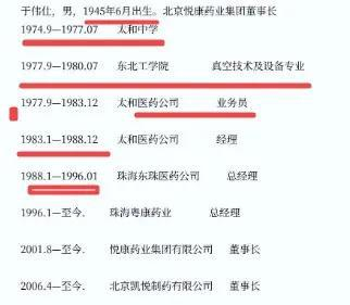 据人民网消息,于伟仕早年毕业于安徽阜阳市太和县太和中学,在东北工学院真空技术与设备专业读书三年,后担任太和医药公司业务员、经理,1988年1月开始担任珠海东珠医药公司总经理,后任珠海粤康药业总经理。于伟仕曾因经营头孢类产品被业界熟知,被称为“头孢大王”。当然,这份简要经历也存在疑问,如读书时间和业务员时间重合等。