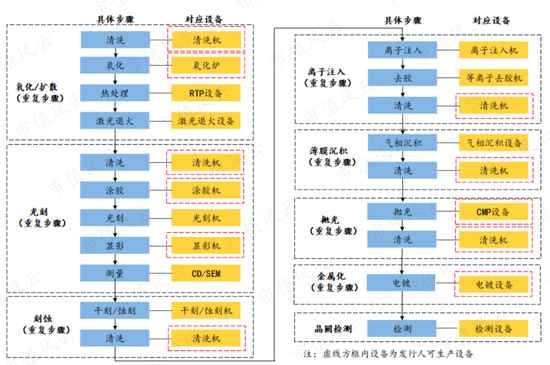 前道晶圆生产过程的七大工序(氧化/扩散-光刻-刻蚀-离子注入-薄膜沉积-抛光-金属化)中,需要许多不同种类的专用设备,其中红色方框为盛美股份可生产的设备。