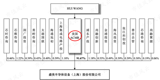 盛美股份的控股股东为美国ACMR,目前持有盛美股份91.67%的股权,实际控制人为HUI WANG(王晖),美国国籍,同时担任盛美股份董事长,以及美国ACMR的董事长和CEO。