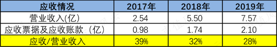 而应收账款的比例不低,2017年-2019年应收款项(应收票据+应收账款)占当期收入分别为39%、32%和28%。