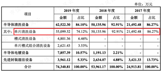 但收入占比最高的还是半导体清洗设备,而且以单片清洗设备为主,2017年-2019年占营业收入比例分别为86.27%、92.91%和74.21%。