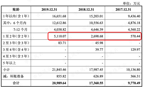 从应收账款账龄来看,1-2年的有所增加,2017年-2019年1年内应收账款占比为96.58%、87.57%和79.33%,有所降低,说明应收账款风险在增加。