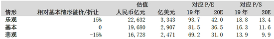 采用PE估值法,基于同业估值水平均值32.7倍2020年PE对公司进行估值,得到在基本情形下,公司估值为人名币17649亿元(相当于2607亿美元)。