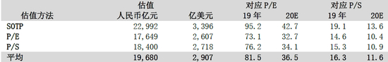 鉴于公司估值还将受到上市时市场氛围、投资者对公司的关注度等因素影响,认为乐观情形下公司估值可达到人民币22632亿元(相当于3343亿美元),悲观情形下估值为人民币16728亿元(相当于2471亿美元),即合理估值区间为16728-22632亿元(相当于2471-3343亿美元),对应31-42倍2020年预测PE及9.9-13.4倍2020年预测PS。