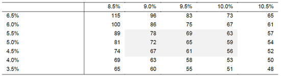 图9:绝对估值相对折现率和永续增长率的敏感性分析(元)