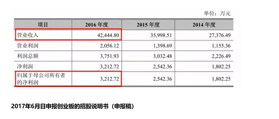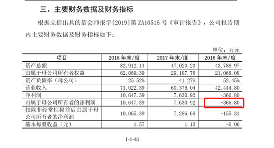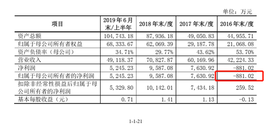 但这一数据在2019年其申请科创板上市的第一版招股书中,2016年营收虽然未有改变,但归母净利润却从盈利3000余万转而变成亏损366.8万,前后调整幅度之大,令人咂舌。