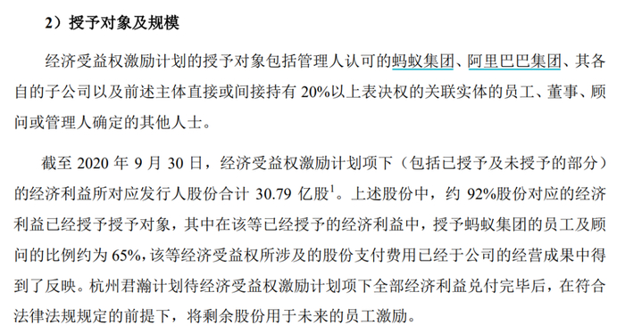 而根据蚂蚁的招股书显示,截至2020年9月30日,经济受益权激励计划项下(包括已授予及未授予的部分)的经济利益所对应发行人股份合计30.79亿股,其中,授予蚂蚁集团的员工及顾问的比例约为65%。