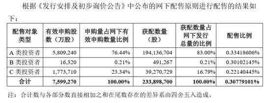A股超额配售选择权及网上、网下回拨机制启动后,网下最终发行数量为2.34亿股,占本次A股发行股份数量的12.17%;网上最终发行数量为3.51亿股,占本次A股发行股份数量的18.26%。
