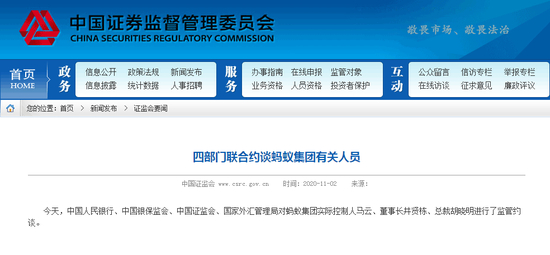 2日,证监会网站消息称,中国人民银行、中国银保监会、中国证监会、国家外汇管理局对蚂蚁集团实际控制人马云、董事长井贤栋、总裁胡晓明进行了监管约谈。