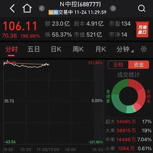 作为业内龙头,中控技术一上市股价就大涨,截至24日午间收盘,中控技术股价涨幅196.98%,股价报106.11元,总市值达521亿。