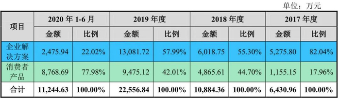 2017年至2020年1-6月,柔宇实现营业收入为0.65亿元、1.09亿元、2.27亿元、1.16亿元。其中,柔宇C端产品占比逐年增加,到2020年上半年,消费类产品占比达到77.98%。