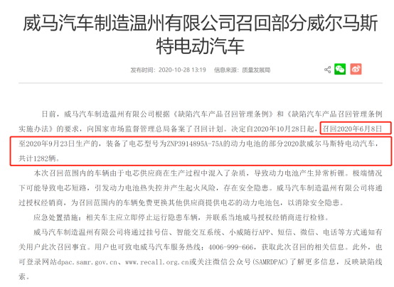 2020年10月28日,威马汽车召回2020年6月8日至2020年9月23日生产的1282辆存在缺陷的汽车。这些被召回的汽车电池存在安全隐患,威马汽车免费为召回汽车更换电池。