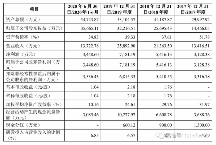 华锐精密2017年、2018年、2019年净利分别为3128万元、5416万元、7181万元;华锐精密2020年上半年净利为3448万元。