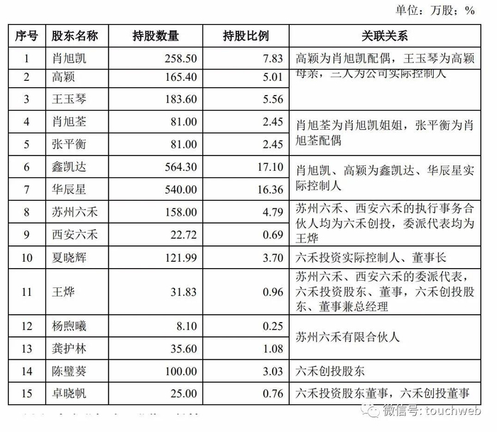 IPO后,肖旭凯直接持股为5.87%,高颖直接持股为3.76%,王玉琴直接持股为4.17%,鑫凯达持股为12.82%,华辰星持股为12.27%