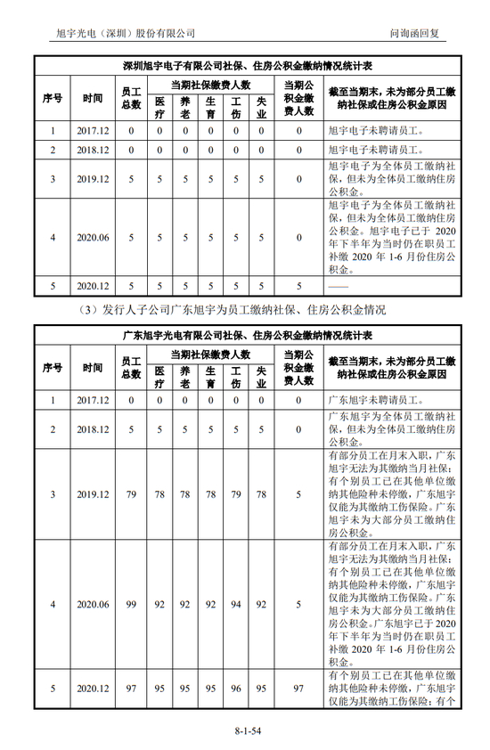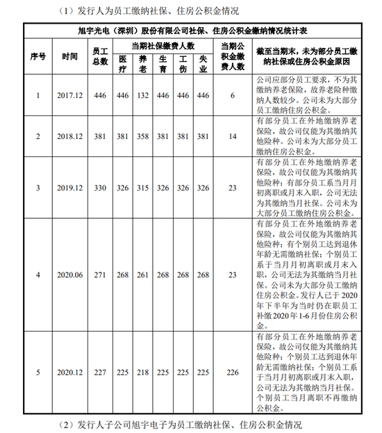 深圳市住房公积金管理中心于 2020 年 11 月 9 日出具《单位住房公积金缴存证明》(编号:20110900089895),证明旭宇电子在缴存时段(2020 年 1 月至2020 年 10 月)内没有因违法违规而被该中心处罚的情况。(注:旭宇电子于 2019年 3 月开始聘用员工且员工较少,至 2020 年 1 月才办理住房公积金开户登记并开始缴存,深圳市住房公积金管理中心仅能从发行人缴存之日起开具相关证明)深圳市社会保险基金管理局于 2021 年 3 月 2 日出具《证明》,证明旭宇电子自 2020 年 7 月 1 日至 2021 年 1 月 31 日期间无因违反社会保险法律、法规或规章而被该局行政处罚的记录。