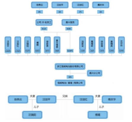 经过数次股权转让、增资扩股后,目前恒威电池实际控制人为汪剑平、汪剑红兄妹家族六人,即汪剑平、徐燕云、汪骁阳、 汪剑红、傅庆华、傅煜。其中,汪剑平与徐燕云为夫妻关系,其子为汪骁阳;汪剑红为汪剑平之妹,汪剑红与傅庆华为夫妻关系,其子为傅煜。六人直接或间接合计持有恒威电池93.11%的股份。